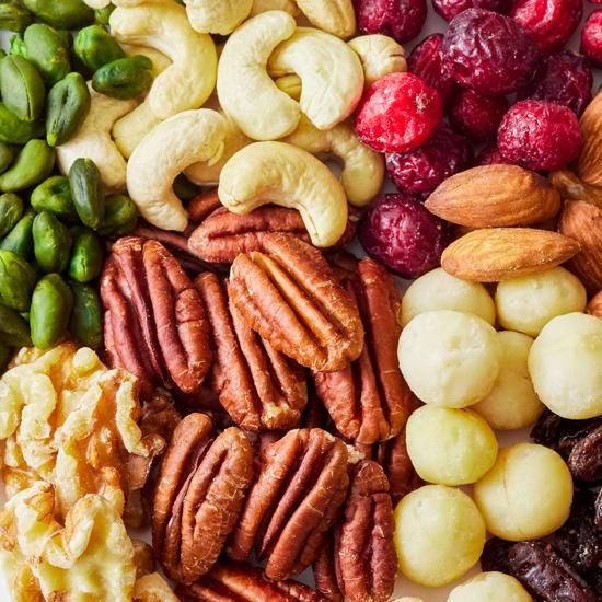 マカデミアナッツ15g、アーモンド25g、クランベリー3g、レーズン5g、くるみ12g